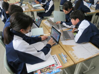 こちらは3年生の総合的な学習。修学旅行の自主研修は札幌・小樽であります。調べたいことをプリントにまとめ、タブレットを使って調べていました。