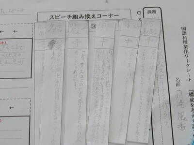 前時に作ったスピーチを、バラバラにして、目指すスピーチに応じて、組み立て方を工夫するものです。