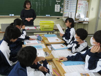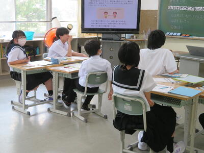 1年生は道徳。題材は『自分で決める』という読み物。吹奏楽部に入ろうとした主人公(女子)。親にもやるからにはしっかりと念を押されて入部した後、友人がやめたいと言い出す。それに対して主人公の気持ちが揺れ動きます。自分が主人公だったら、どんな気持ちか、友人に何というか、互いに考えました。
