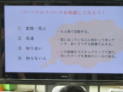 こちらは2年生。性教育です。パーソナルスペースの話です。自分と相手の安全な距離は、レベルによって異なることが紹介されました。