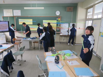 最初は、どちらが大きい?と尋ねていたのに、「答えは変わらない」との結論。せっかく計算したのに”ずるぃ!”と生徒のかすかな声を聞き逃さなかった担任。思わず教室に笑いが出ました。