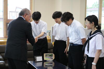 一昨日ですが、生徒会執行部のメンバーで、校内で取り組んだ「みどりの羽根募金」を届けに、役場を訪問しました。