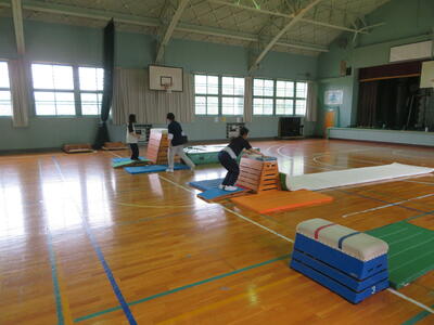こちらは3年体育。跳び箱を超える練習をしています。脚を広げず閉じる形の「閉脚跳び」なので、脚を胸に引きつける腹筋と、怖さを乗り越える勇気が必要です。