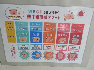 ここ数年、熱中症で児童生徒が搬送される事故が全国で起きています。中頓別中学校でも、WBGT(Water Bulb Globe Tempureture:湿球黒球温度)という暑さ指数を掲示して、予防対策をとっています。