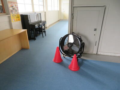 各場所、各階に貼ってあります。また、共同生活の小学校からは、各階廊下に大きな扇風機を付けて、熱がこもらないように助けてくれています。互いにできることを協働しながら熱中症対策を進めています。