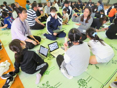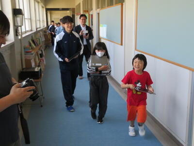 小学生と中学生が仲良く案内しています。撮影した写真はPadletで共有しました。