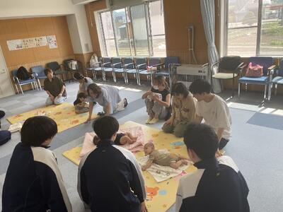 いざ、抱っこ体験が始まると笑顔になったり、声かけや身振り手振りで呼びかけたりと、愛情を持って接したり、自分なりのやり方で子どもと遊ぶ生徒が増えました。とてもいい笑顔です。