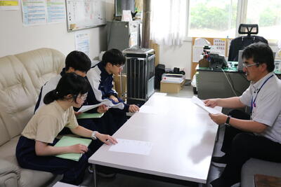 生徒会が到着した際には、町長さんが会議室にて待っておられました。みどりの羽根募金は、町内の緑化事業に使われます。