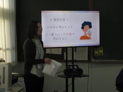講師は,中頓別町の栄養教諭のS先生です。担任から,みんなの食事場面とマナーの大切さを伝えると,「リラックスして食べたいけど,マナーがなってないとちょっとね」との反応。そう,マナーは大事なんです。