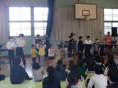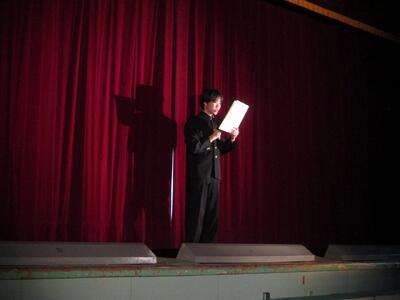 トップバッターは1人で発表。でも最後の〆を助けに担任が登場し,仲良く退場しました。