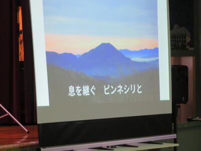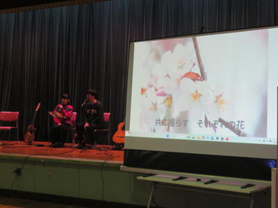 豊かな自然,子ども園,小学生,中学生の様子のスライドが流れる中,小林さんのピアノに合わせてChimaさんと成山さんの歌声が響き,「この町で,仲間と一緒に学び,苦しいことも乗り越えよう」というメッセージが伝わりました。