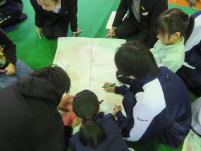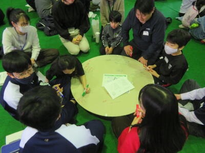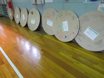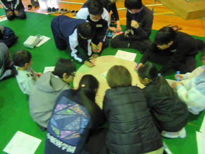 次は,グループ毎に分かれて,新しい校歌の感想を,町内参加者,町外のゲスト,小学生・中学生も含めて,丸い段ボール用紙(えんたくん)に書きました。