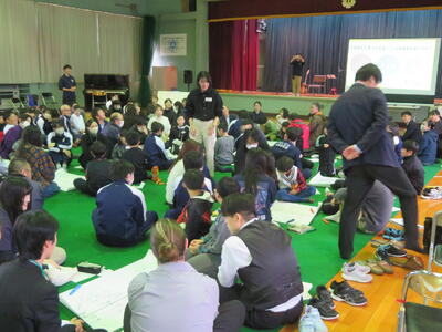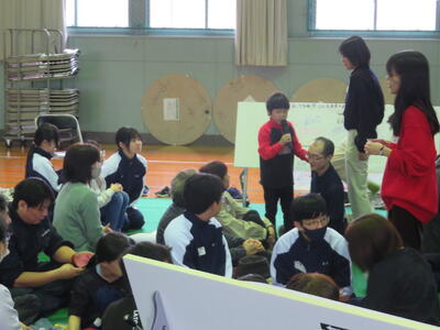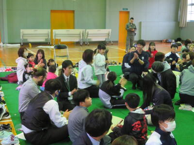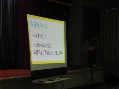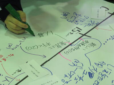 「人生会議」の方法です。小中学生・ゲスト・先生・地域の方々,いろんな世代のいろんな意見を自由に出し合い,肯定的に受け入れるミーティングです。